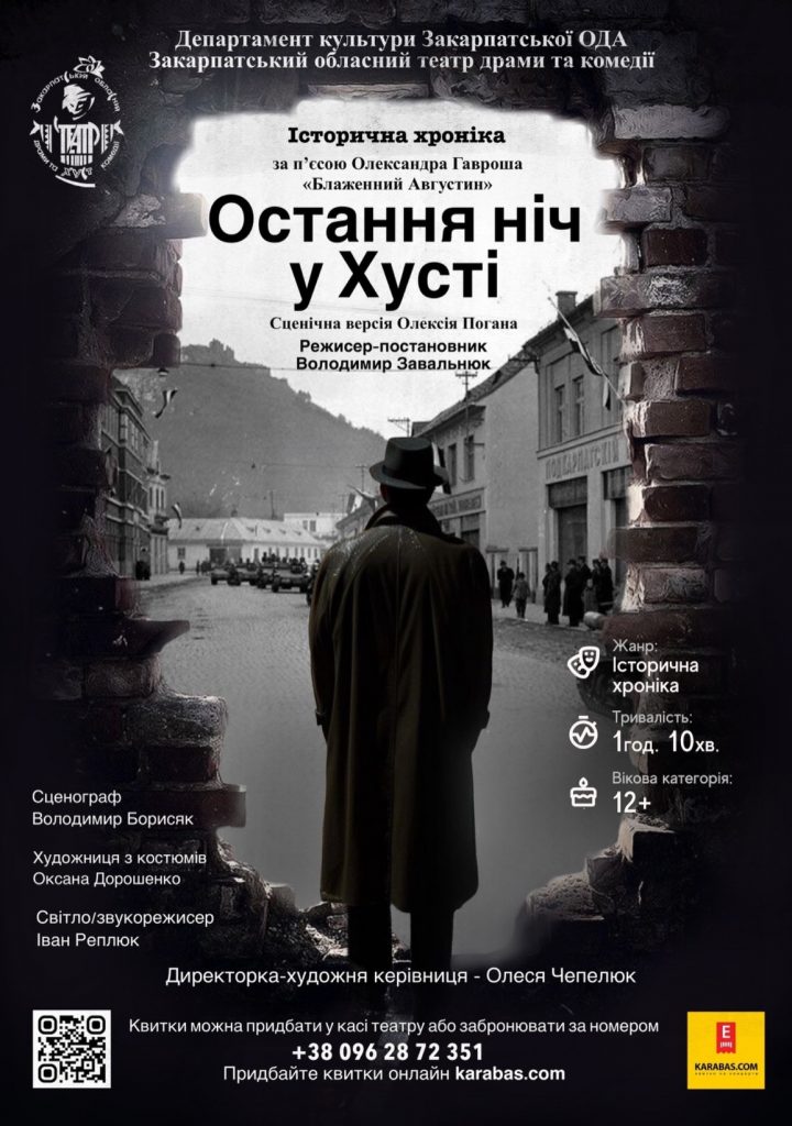 13 березня о 18:00 – показ вистави-історичної хроніки про діяльність президента Карпатської України Августина Волошина «Остання ніч у Хусті» за мотивами п’єси Олександра Гавроша «Блаженний Августин» (сценічна версія – Олексія Погана, режисер-постановник – Володимир Завальнюк).