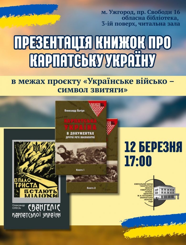 12 березня о 17:00 – презентація книг про Карпатську Україну в межах проєкту «Українське військо – символ звитяги», яку проводить група цивільно-військового співробітництва Закарпатського ОТЦК та СП. Захід буде присвячено пам’яті випускника історичного факультету Ужгородського національного університету та Українського католицького університету Тараса Гайдука, дослідника Карпатської України, посмертно нагородженого орденом «За мужність» ІІІ ступеня.