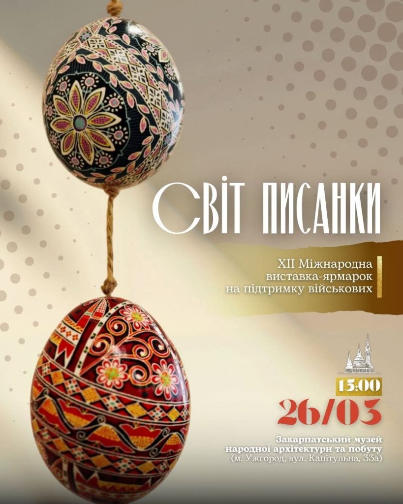 А в Закарпатському музеї народної архітектури та побуту буде розгорнуто XII Міжнародну благодійну виставку-ярмарок «Світ писанки». Увазі відвідувачів представлять писанки з фондової колекції, а також авторські роботи – від майстринь із різних куточків Закарпаття, низки областей України та з-за кордону. Вже п’ятий рік поспіль виставка не тільки створюватиме великодній настрій, але й передбачає продаж частини писанок на підтримку Збройних Сил України.
