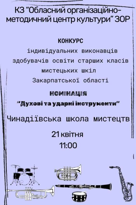 II. «Духові та ударні інструменти» – 21 квітня об 11:00 у Чинадіївській школі мистецтв;