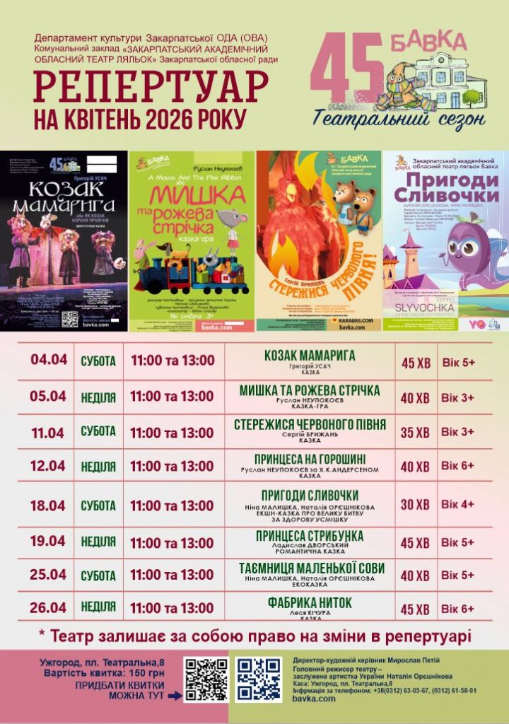 Закарпатський академічний обласний театр ляльок цього місяця тішитиме своїх глядачів вистави «Козак Мамарига», «Мишка та рожева стрічка», «Стережися червоного півня», «Принцеса на горошині», «Пригоди Сливочки», «Принцеса-стрибунка», «Таємниця маленької сови» та «Фабрика ниток».