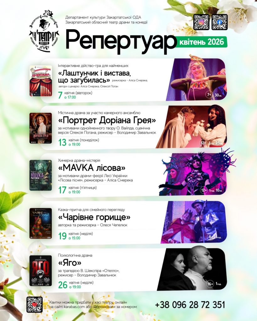 Закарпатський обласний театр драми та комедії (м. Хуст) пропонує переглянути вистави для дітей «Лаштунчик і вистава, що загубилась» та «Чарівне горище», і для дорослих – «Портрет Доріана Грея», «MAVKA. Лісова пісня» та нещодавню прем’єру – психологічну драму «Яго» за мотивами трагедії Вільяма Шекспіра «Отелло» у постановці Володимира Завальнюка.
