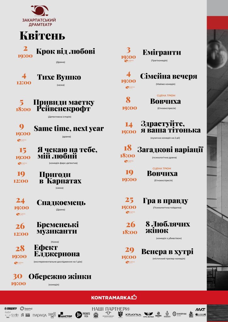 Закарпатський академічний обласний український музично-драматичний театр ім. братів Ю.-А. та Є. Шерегіїв для маленьких і юних шанувальників театру покаже казки «Тихе вушко», «Пригоди в Карпатах» і «Бременські музиканти». У репертуарі для дорослих – драма «Крок від любові», трагікомедія «Емігранти», майже комедія «Сімейна вечеря», детективна історія «Привиди маєтку Рейвенскрофт», вистава-етноекспресія «Вовчиха», драма «Same Time, Next Year», музична комедія на 2 дії «Здрастуйте, я ваша тітонька», комедія-фарс-детектив «Я чекаю на тебе, мій любий», психологічна драма «Загадкові варіації», трагедія «Приречені», драма «Спадкоємець», вистава-психологічна гойдалка «Гра в правду», комедія з убивством «8 люблячих жінок», експериментальне дослідження на 1 дію «Ефект Елджернона», містичний трилер-комедія «Венера в хутрі», комедія «Обережно – жінки».