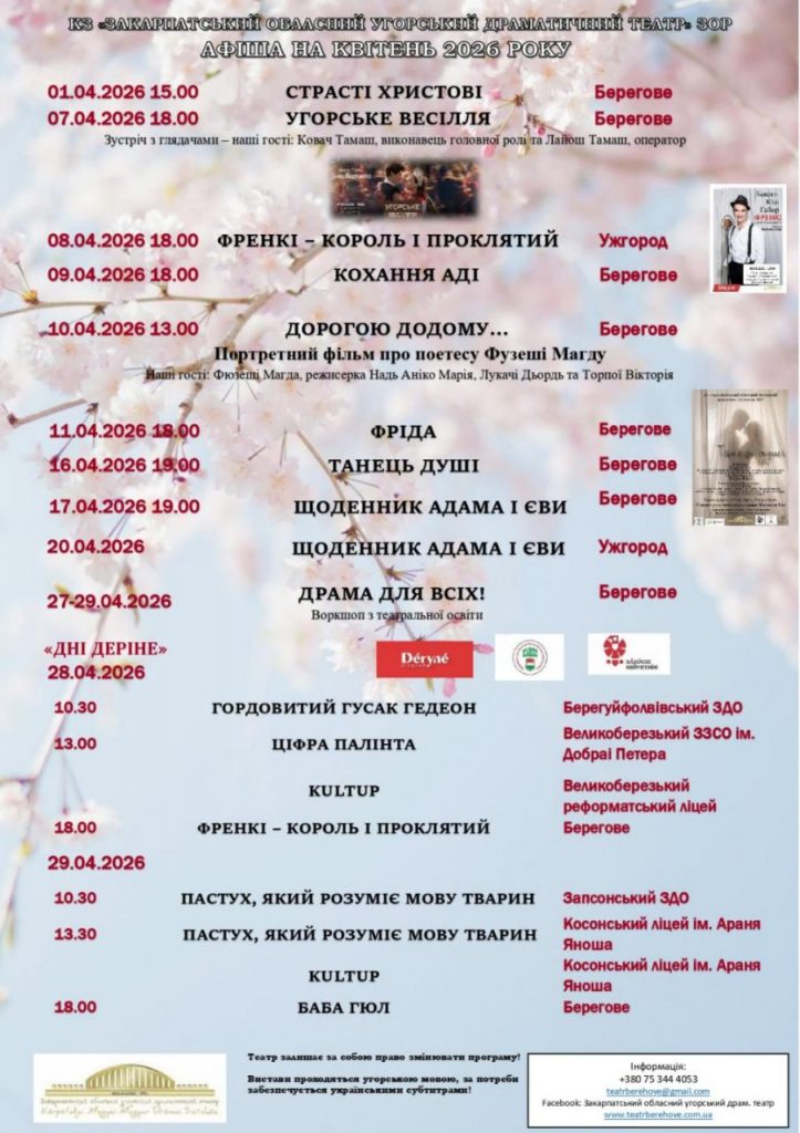 Закарпатський обласний угорський драматичний театр (м. Берегове) запланував покази вистав «Френкі – король і проклятий», «Кохання Аді», «Фріда», «Щоденник Адама і Єви», «Гордовитий гусак Гедеон», «Ціфра Палінта», «Пастух, який розуміє мову тварин», «Баба Гюл», театральні програми для школярів «KultUp», а також низку кінопоказів.