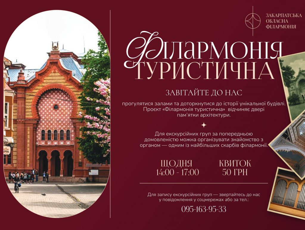 Щодня з 14:00 до 17:00 – у межах нового проєкту «Філармонія туристична» охочі можуть завітати до будівлі, прогулятися залами та доторкнутися до історії унікальної пам’ятки. Для екскурсійних груп за попередньою домовленістю також влаштують знайомство з органом – одним із найбільших скарбів філармонії. Записатися на відвідання можна через соцмережі закладу або за телефоном: +38 (095) 163 95 33.
