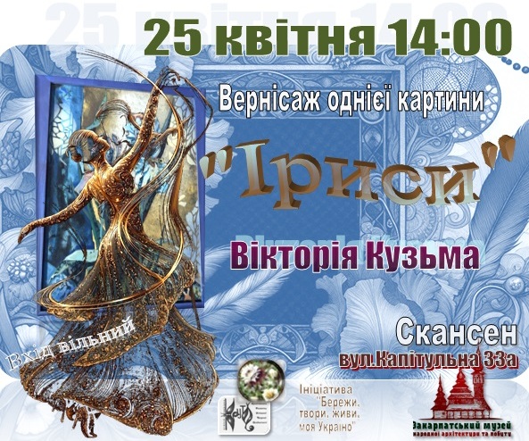 25 квітня о 14:00 – вернісаж однієї картини – «Іриси» – авторства знаної мисткині, лауреатки Обласної премії ім. Й. Бокшая та А. Ерделі, голови секції декоративно-прикладного мистецтва Закарпатської організації Національної спілки художників України Вікторії Кузьми. Творчу зустріч прикрасять виступи ансамблю класичного танцю «Натхнення» Академії культури і мистецтв, театральної студії «КРУТО» та хореографічної студії «Majestic». Вхід вільний.