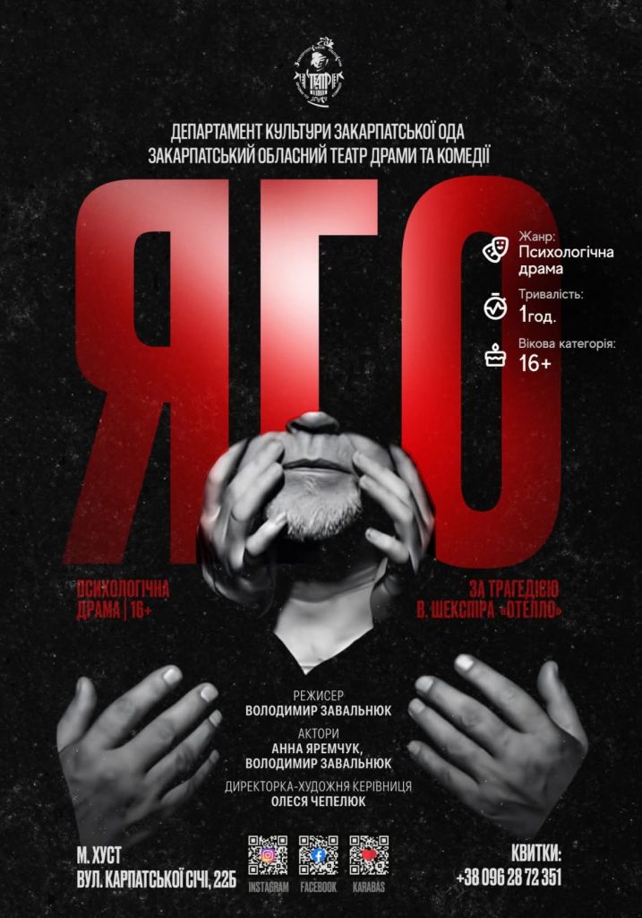 26 квітня о 19:00 – психологічна драма «Яго» за мотивами трагедії Вільяма Шекспіра «Отелло» у режисерському втіленні Володимира Завальнюка.