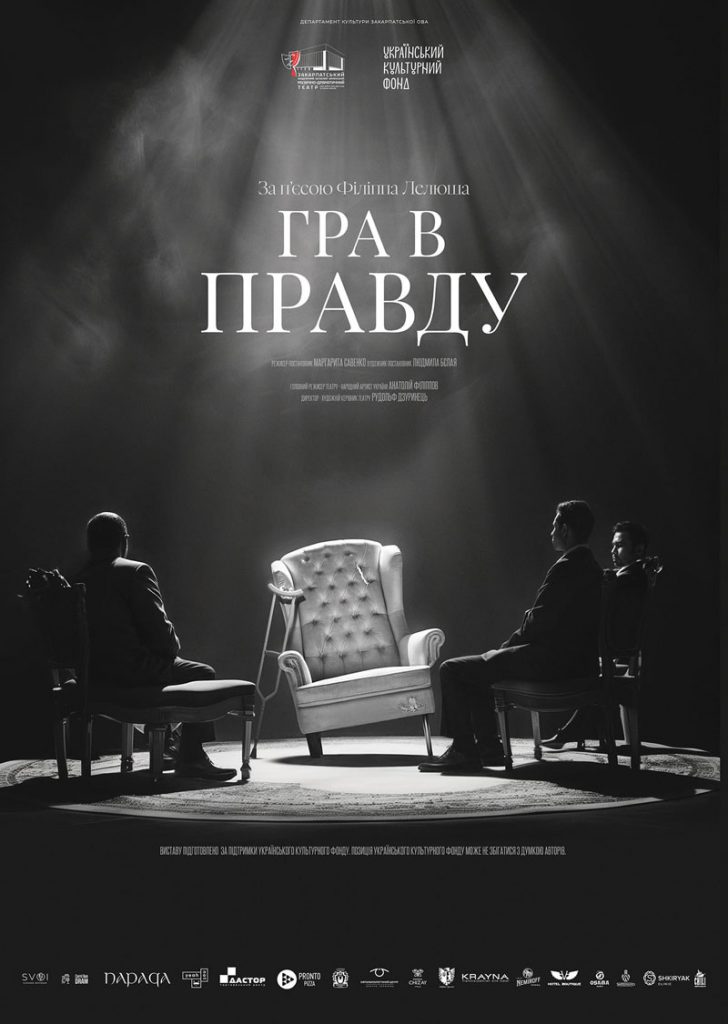25 квітня о 19:00 – вистава-психологічна гойдалка «Гра в правду» за п’єсою Філіпа Лелюша від режисерки Маргарити Савенко (мала сцена).